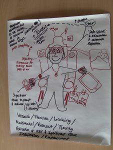We had been asked to bring along a keepsake that evoked positive memories to the workshop – something we would be happy to share with others and these started some interesting discussions – in particular around why remembering these particular memories are important for our well-being. Our table identified how people collect keepsakes in different ways – one person had ‘collections’ of toys, badges and musical instruments that they nurtured and which were a big part of their lives, whereas another person had keepsakes that were emotionally attached to home, childhood and the people in her life. Everyone agreed their objects produced memories or experiences of nostalgia.
