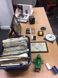Accordingly, our project aims to capture not only personal memories but also essence, identity and the indiscernible. Rachel presented a display exploring different tools that help us ‘remember’ in different ways and told stories relating to some of the objects she had bought in, including a box of photos and letters, a drawing of her grandmother, an old Thunderbird Toy and an old 1950’s camera! She talked about some existing digital and online memory tools such as Facebook and Google and addressed how we manage the way social media triggers and presents us with ‘memories’.