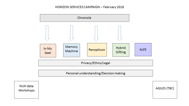 The Chronicle project was part of the Horizon Services Campaign. It was a cross-cutting project intended to develop a middle-ware platform to support the aims and objectives of four of the other Service Campaign projects; namely: Panopticon, Hybrid Gifting, In My Seat, and Memory Machine. As is the nature with dynamic research projects, some projects made lesser use of the Chronicle platform whilst others made greater use. To wrap up we will finish by describing how Chronicle was used in two of the service campaign projects.